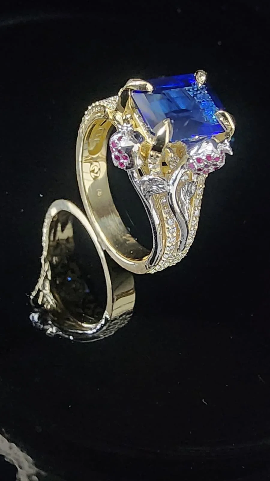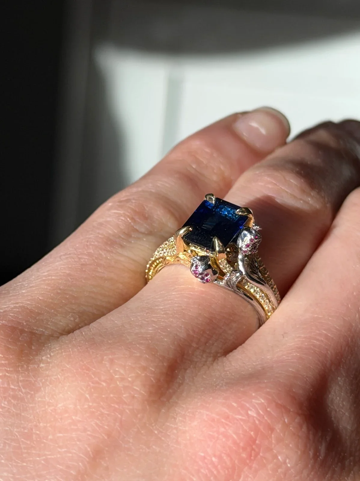 Speechless… I was left absolutely speechless after receiving my engagement ring. While Albert worked on it discretely with my husband it turned out better than I could have imagined. He was very helpful and engaged during the design process especially considering we wanted a sapphire center stone and not a traditional engagement ring. He was able to create a piece of art that is so unique to us and so special. Every angle tells a different story and o cannot stop staring it and the details!